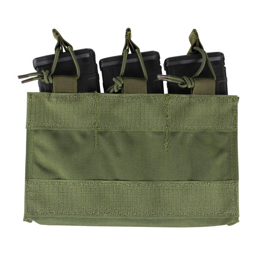 Kieszenie otwarte typu CQB z zabezpieczającym zawartość elastycznym i regulowanym trokiem, z których każdy posiada specjalny uchwyt umożliwiający obsługę także w rękawicach.