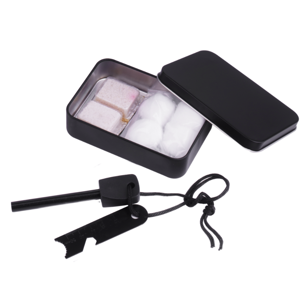 Zawiera krzesiwo surwiwalowe, dwa kłębki waty oraz