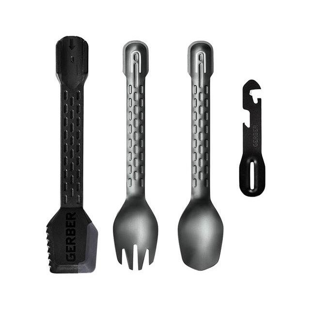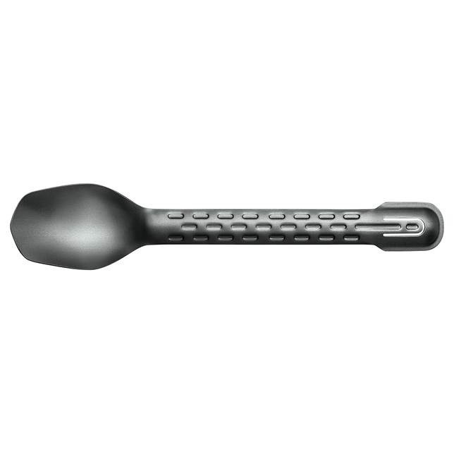 W zestawie znajdują się spork, łyżka, szpachelka i multitool, które przy użyciu uchwytu wbudowanego w szpachelkę składają się w poręczny pakiet.