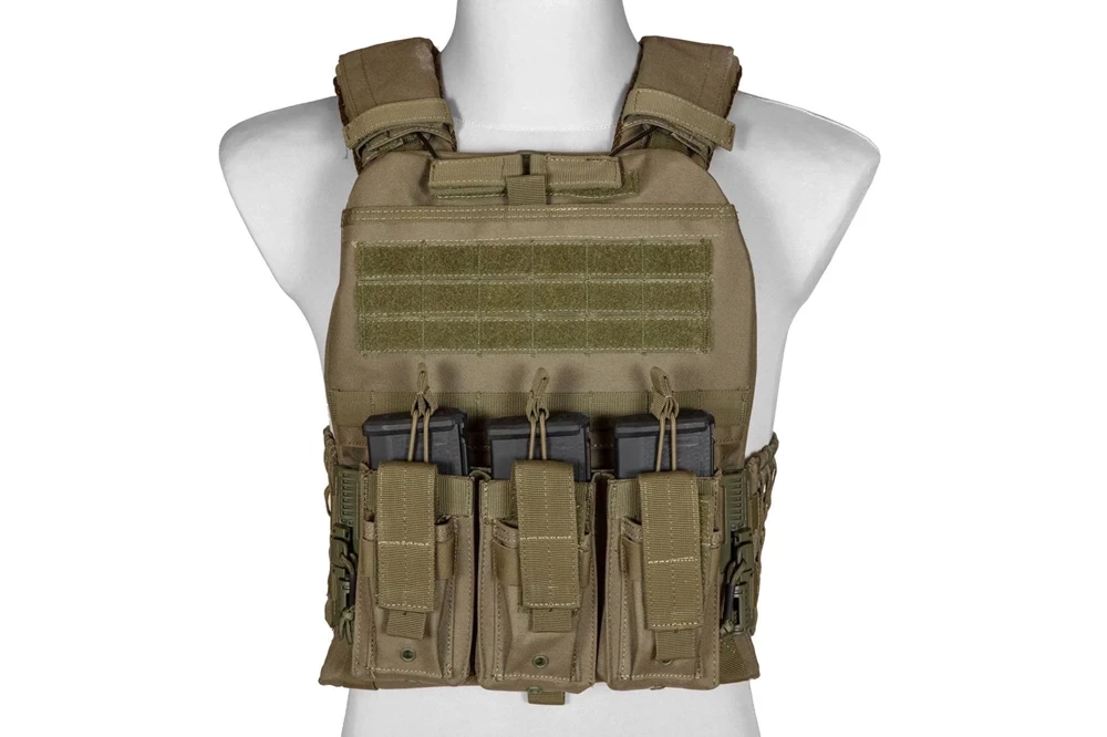 System MOLLE pozwala na łatwe dopasowanie dodatkowego wyposażenia, np. ładownic na magazynki lub kieszeni admin pouch. Kamizelka posiada miejsce na wkłady balistyczne, system szybkiego wypięcia Quick Release oraz ładownicę na 3 magazynki M4/M16/AK i 3 pistoletowe.