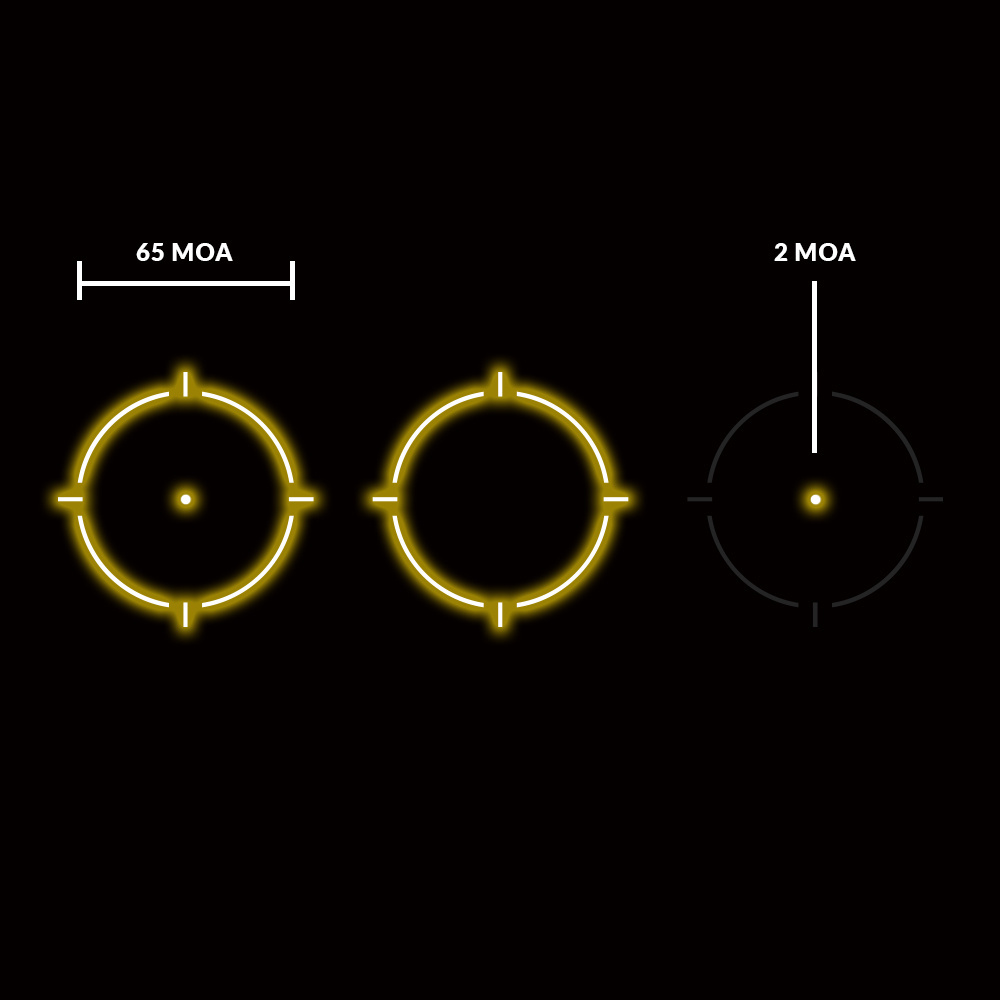 Kolimator HE512C-GD Gold Dot z punktem celowniczym koloru złotego umożliwia użytkownikowi wybór jednego z trzech rodzai punktu celowniczego - kropka ( 2 MOA), okrąg (65 MOA) lub kropka z okręgiem (2 / 65 MOA).
