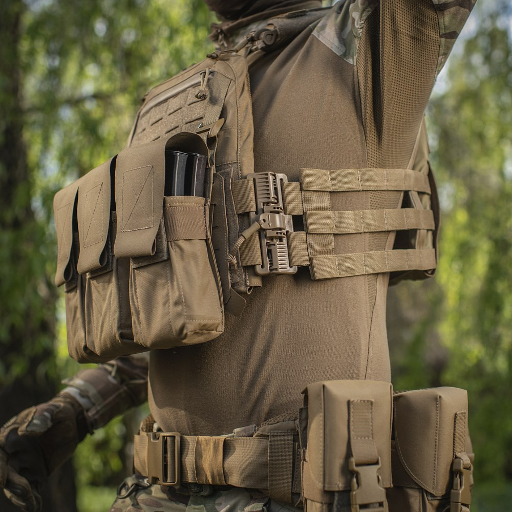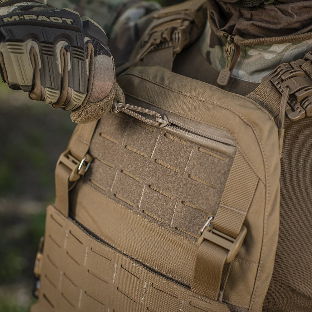 Kamizelka taktyczna typu Plate Carrier z miejscem na wkłady balistyczne standardu ESAPI w rozmiarze M. Wyposażona została w system szybkiego wypięcia pozwalający w sposób intuicyjny i bezpieczny, w razie konieczności, oswobodzić się z kamizelki. Kamizelka jest kompatybilna z systemem MOLLE przez co umożliwia montaż dodatkowych ładownic np. kieszeni cargo pouch.