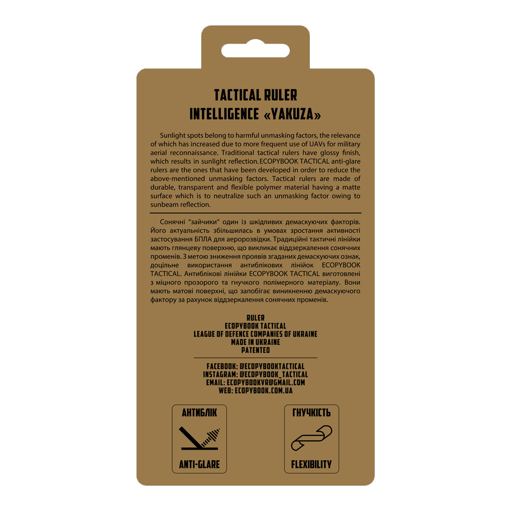 Linijka taktyczna Ecopybook od firmy M-Tac wykonana jest z elastycznego i przezroczystego polimeru. Znajdzie zastosowanie podczas opracowywania map polowych. Różni się od tradycyjnych linijek tym, że została stworzona z matowego materiału, który zapobiega odblaskom. Takie rozwiązanie ułatwia ukrycie swojej pozycji i tym samym zwiększa bezpieczeństwo użytkownika.