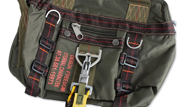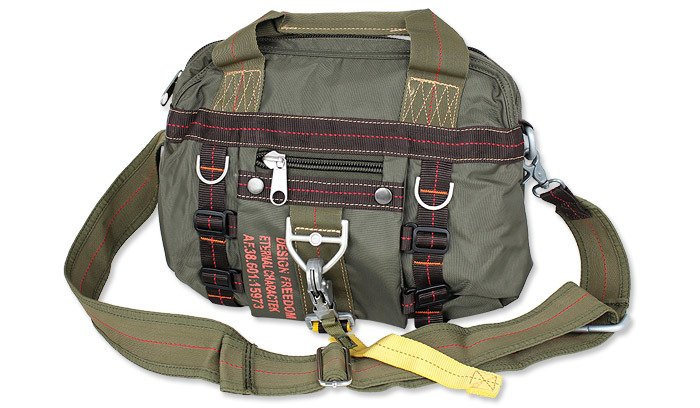 Pilot Bag wyposażony jest w dwa uchwyty do noszenia w ręce oraz regulowany, odpinany z jednej strony, pas do noszenia na ramieniu. Na przedniej ścianie znajdują się dwa metalowe D-ringi oraz duża, metalowa klamra będąca wyłącznie elementem ozdobnym.