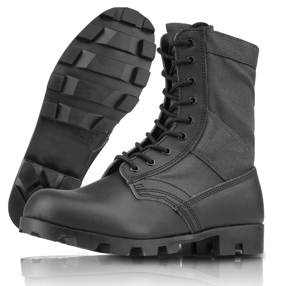 Buty wojskowe US Jungle Boots od firmy Mil-Tec to obuwie całoroczne inspirowane modelami używanymi przez amerykańskie siły zbrojne podczas konfliktu w Wietnamie. Cholewka wykonana z grubo plecionego nylonu zapewnia wentylację i odporność na przetarcia, a wodoodporna skóra licowa w dolnej części buta chroni przed wilgocią. Dodatkowe nylonowe taśmy na wysokości kostek wzmacniają konstrukcję i stabilizują stopę.