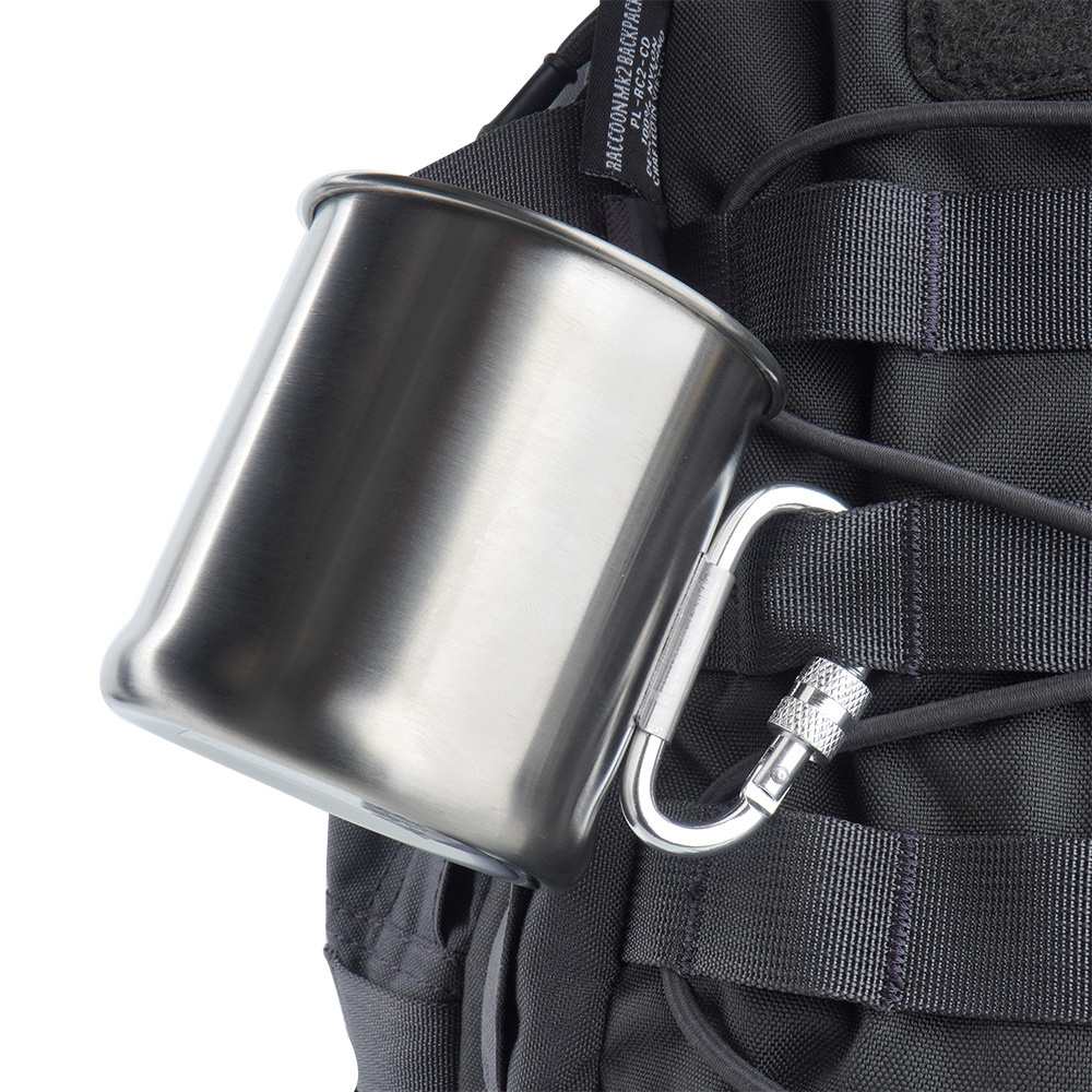 Kubek wykonany ze stali nierdzewnej dodatkowo wyposażony w ucho w formie karabińczyka, umożliwiający jego zamocowania np. przy plecaku.