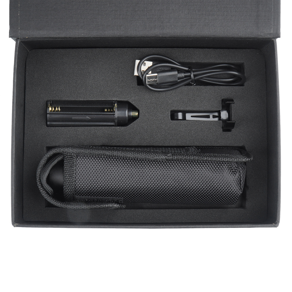 Latarka zapakowana jest w stylowe pudełko prezentowe zamykane klapką z magnesem. W środku wyłożone jest pianką z wycięciem pod elementy zestawu. Do latarki dołączony jest metalowy klips na pasek, ładowarka USB-C, rzemyk na nadgarstek i pokrowiec zamykany na klapkę z rzepem, wyposażony w szlufkę na pasek o szerokości maksymalnej do 65 mm.