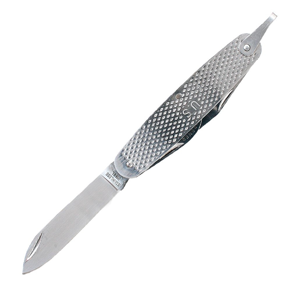 Duże ostrze Otwieracz do puszek Otwieracz do butelek ze śrubokrętem płaskim 5mm Rozwieracz/przebijak Chwyt posiada antypoślizgową strukturę oraz wybite litery "U.S.".