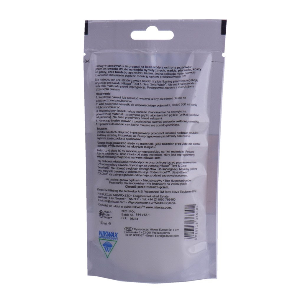 Saszetka z koncentratem o pojemności 150 ml po wymieszaniu z wodą pozwala uzyskać 500 ml impregnatu Tent and Gear SolarProof.