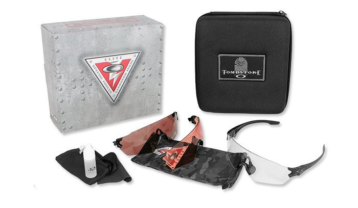 - Wysokiej jakości sztywne etui z montowaną na rzep naszywką Oakley Tombstone. Etui umożliwia przenoszenie wraz z okularami do trzech sztuk zamiennych wizjerów.