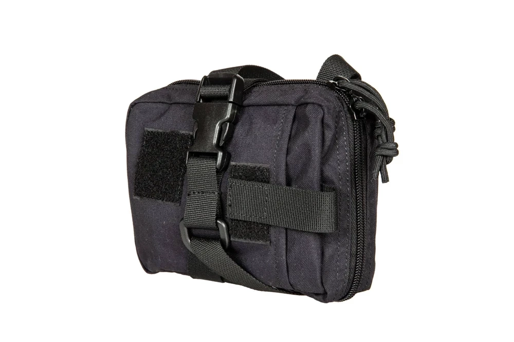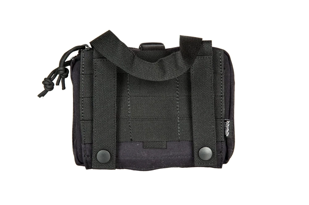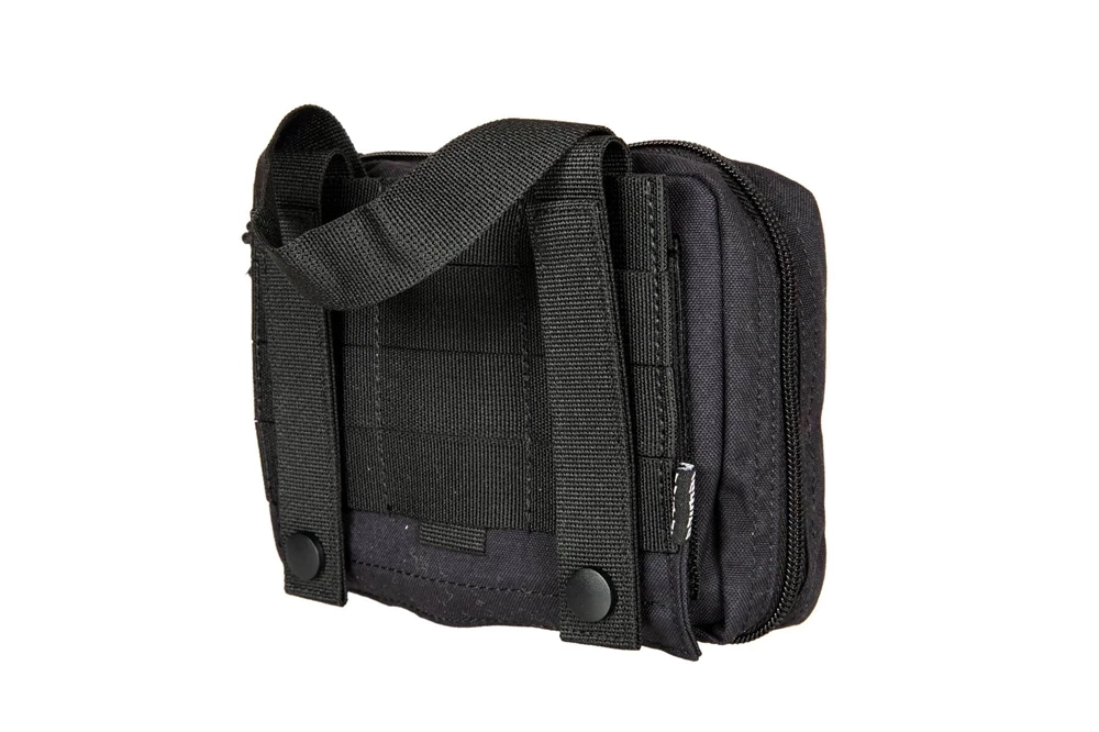 Ładownica dodatkowo zabezpieczona jest taśmą z klamrą. Na przedniej ściance apteczki znajduje się mała płaska kieszonka zamykana na rzep oraz mały panel rzepowy np. na morale patch. Konstrukcja zasobnika jest bardzo uniwersalna, dzięki czemu nada się zarówno na apteczkę jak i ładownicę EDC.
