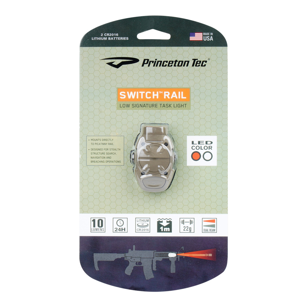 Switch Rail SR-1 wyposażony jest w dwie diody LED w kolorze białym, generujące strumień światła o mocy do 10 lumenów i zasięgu 19 metrów. Latarka posiada trzy tryby pracy, które mogą być zmieniane za pomocą jednego przycisku, umożliwiającego komfortową obsługę również w rękawicach taktycznych. Zasilanie przy użyciu dwóch baterii CR2016 pozwala nawet na 36 godzin pracy.