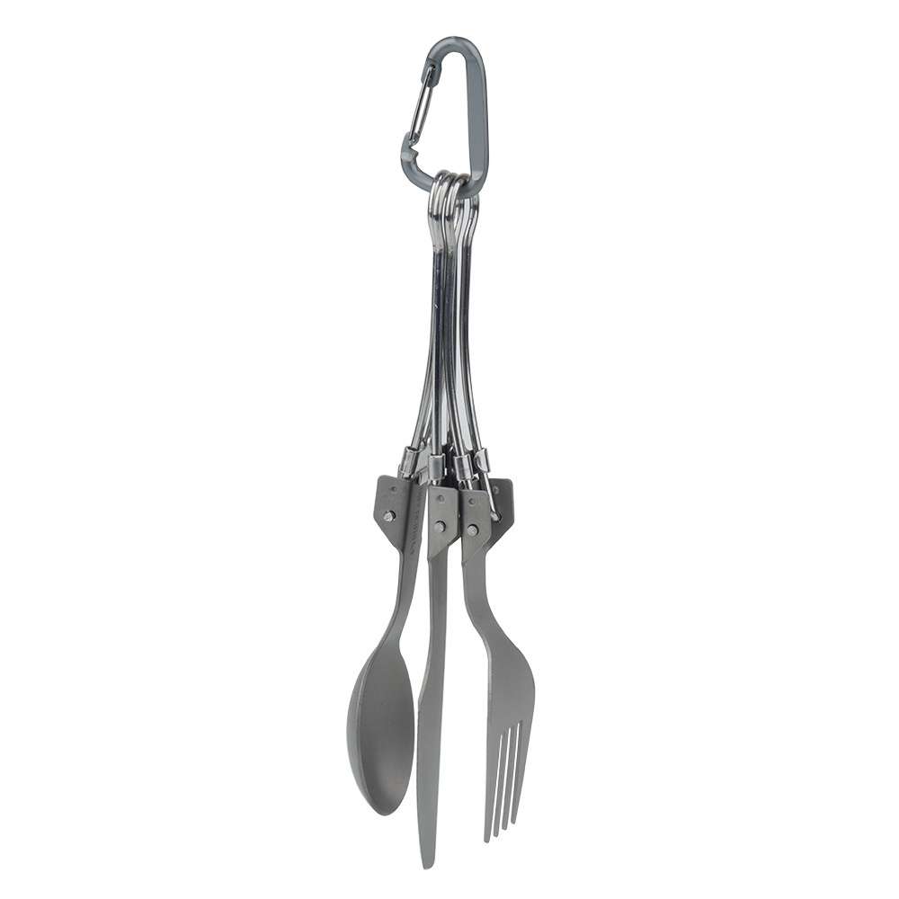 Zestaw składanych sztućców turystycznych wykonanych z tytanu, składający się z łyżki, widelca i noża, wyposażonych w blokady zabezpieczające przed samoczynnym złożeniem i zgodnych z norą EN12546 - 1: 2000. Można je połączyć za pomocą karabińczyka, a w zestawie jest woreczek transportowy.