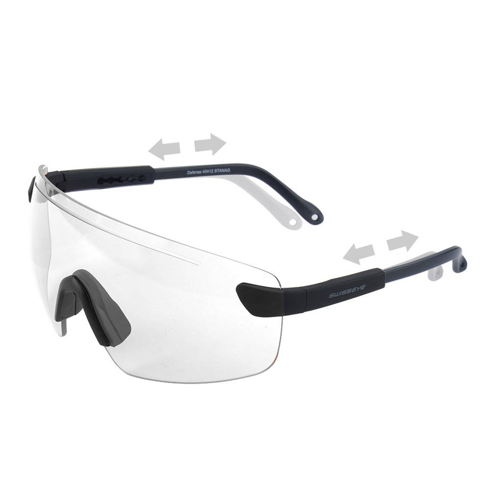 Okulary strzeleckie Defense od firmy Swiss Eye. Posiadają obszerny wizjer mocowany bezpośrednio na zausznikach, który pokrywa znaczną część twarzy. Dzięki niemu użytkownik osłania nie tylko oczy, ale również obszar dookoła oczodołu. Dzięki braku zastosowanych ramek użytkownik będzie miał pokryte pełne pole widzenia wizjerem.