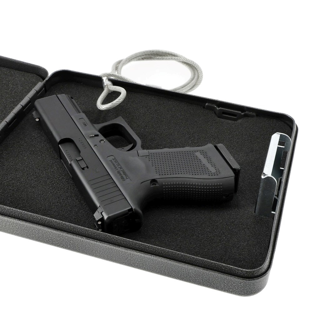 Umarex Safety Box L to mały sejf pozwalający przechowywać wygodnie i w jednym miejscu wszystkie wartościowe przedmioty. Kasetka zamykana jest za pomocą 3 cyfrowego zamka szyfrowego, wyposażona w stalową linkę o długości ok. 90 cm, pozwalającą na przymocowanie Safety Boxa zabezpieczając go przed kradzieżą. Sejf w całości wykonano ze stali pokrytej czarna farbą proszkową, a wnętrze wyścielone jest pianką, która chroni przechowywaną zawartość przed uszkodzeniami.