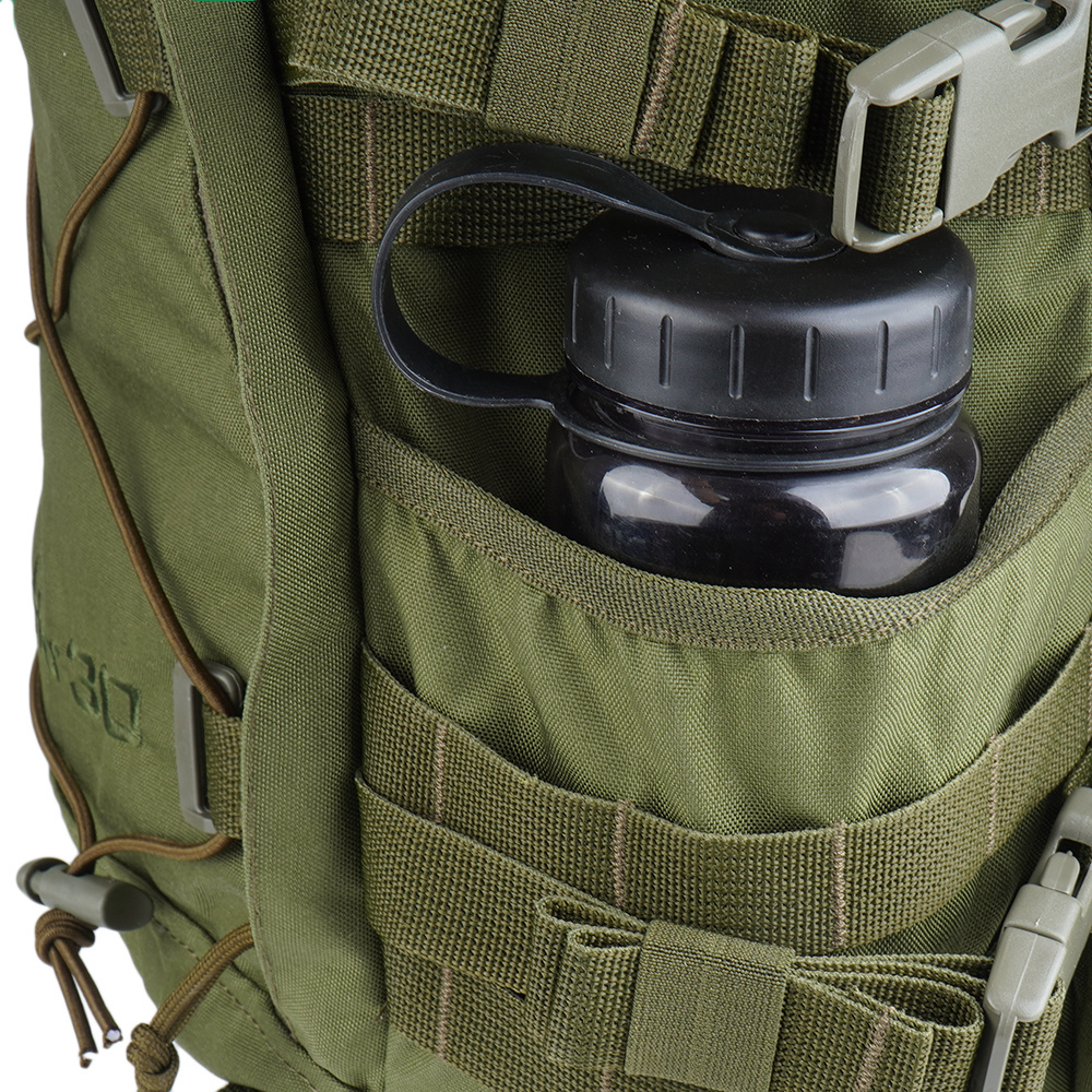 Elastyczne i regulowane linki w przedniej części pozwalają przenosić np. kurtki lub śpiwory. System nośny AFS oparty na stelażu z włókna szklanego zapewnia wysoki komfort użytkowania, a pas biodrowy pomaga w równomiernym rozłożeniu ciężaru. Wykonane ze sprężystej pianki miękkie panele na plecach, bez problemu chłoną wilgoć i są pokryte szybkoschnącą tkaniną. Plecak jest kompatybilny z systemem MOLLE, co umożliwia mocowanie dodatkowych akcesoriów. Dzięki praktycznym uchwytom transportowym można go w łatwy sposób przenosić.
